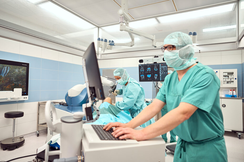 Der Chirurg überwacht mit Hilfe der Software des Roboters in gestochen scharfen 3D-Bildern die gesamte Operation.
