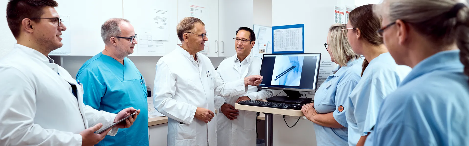 In Einzelfällen behandeln wir Brüche auch konservativ – bevorzugt nach Samiento/Brace-Verfahren. Operationsbedürftige Wirbelsäulenbrüche können bei uns versorgt werden. Komplexe Handverletzungen und komplizierte Beckenbrüche werden in der Unfallchirurgie in den St. Vincenz-Kliniken versorgt.