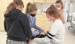 Gipsen, Knochenbrüche schienen, reanimieren, Leben retten – so sahen die Projekttage der 17 Schüler des Gymnasiums Schloss Neuhaus aus, die im St. Vincenz-Krankenhaus zu Gast waren. Drei Tage lang stand das Thema Erste Hilfe im Rahmen des Schuljubiläums auf den Stundenplan.