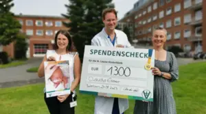 Pia Lages, Pflegedienstleiterin St. Louise, Dr. Frank Dohle, Oberarzt in der Klinik für Kinder- und Jugendmedizin, und Claudia Esser während der Spendenübergabe.