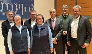 von links: Jürgen Thau (Geschäftsführer), Sr. Berandette M. Putz (Geschäftsführerin), Markus Funk (Geschäftsführer), Sr. M. Katharina Mock (Generaloberin der Vincentinerinnen), Dr. Rainer Eckert (Sachwalter), Dr. Christoph Niering und André Dobiey (Generalbevollmächtigte)