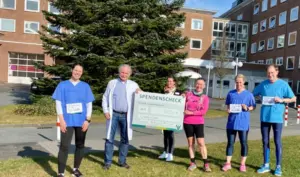 Die letzten Kilometer zur Spendenübergabe wurde sie von einigen Läufern aus der Kinderklinik begleitet: Oberarzt Dr. Thomas Lehmler – der die Familie vor 22 Jahren mitbetreut hatte, Michaela Kretzschmar, Teamleiterin Pflege auf der Frühchen-Station, sowie Annekathrin Kronsbein (Ansprechpartnerin für Spenden) joggten beim schönstem Sonnenschein gemeinsam mit Claudia Esser zur Kinderklinik. „Eine wirklich tolle Aktion“, zeigt sich Chefarzt PD Dr. Friedrich Ebinger beeindruckt.