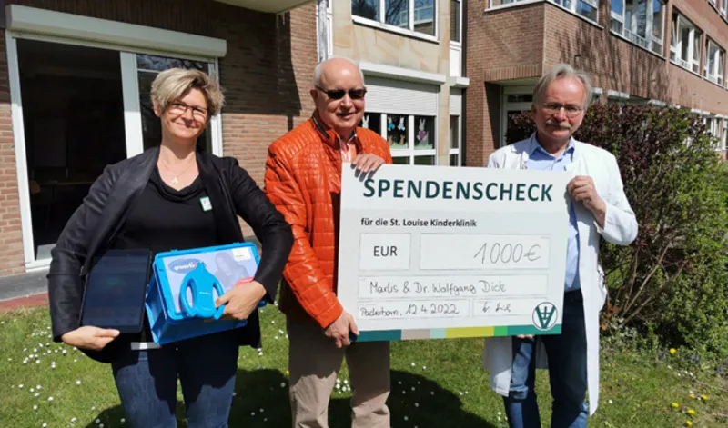 „Die Kinder können auf dem Tablet sofort wahrnehmen, was sie mit ihrem Atem bewirken. Diese direkte sichtbare Rückkoppelung verbessert das Atemtraining um ein Vielfaches“, freut sich Katrin Frank, Leiterin der Therapieabteilung der St. Vincenz-Kliniken. „Unsere Therapeuten hatten sich schon lange einen Groovtube für die Patienten der Kinderklinik gewünscht.“ Eingesetzt wird das Gerät bei Kindern ab ca. 5 Jahren, die unter einer akuten Lungenerkrankung wie Lungenentzündung oder einer chronischen Erkrankung wie Mukoviszidose oder Asthma leiden. Auch Kinder mit neuro-muskulären Erkrankungen, die eine zunehmende Atemschwäche entwickeln, profitieren davon. „Die Kinder sind von dem neuen Atemtrainer begeistert“, bestätigt Chefarzt PD Dr. Friedrich Ebinger. „Ich freue mich sehr darüber, dass wir unseren lungenkranken Patienten in der Klinik für Kinder- und Jugendmedizin dank dieser großzügigen Spende nun auf eine so kindgerechte Weise noch besser helfen können.“ 1000 Euro hatten die Eheleute Dick für das spezielle Therapiegerät gespendet. „Kindern zu helfen ist meiner Familie und mir eine Herzensangelegenheit“, betont Dr. Wolfgang Dick, der der Klinik aus alter Verbundenheit als ehemaliger Chefarzt besonders nahesteht. Das kann man auch in seinem Buch „Kinder, Kinder“ nachlesen, das er gerade fertiggestellt hat.