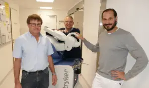 Auch die Chefärzte der beiden Kliniken für Orthopädie, Unfallchirurgie und Sporttraumatologie, Dr. Lutz Mahlke und PD Dr. Marco Ezechieli, sind von ihrem neuen technischen Helfer begeistert. „Die Robotik hat unsere Orthopädie auf ein neues Level gehoben“, so die Chirurgen. Inzwischen feierte der Roboterarm eine weitere Premiere: Er wurde bereits zur Implantation von Hüftgelenken eingesetzt. „Der Eingriff an der Hüfte ist noch einmal komplizierter, da das Gelenk schwerer zu erreichen ist als das Kniegelenk. Die bisherigen Operationen liefen ohne Komplikationen und die Ergebnisqualität ist sehr gut“, so Ezechieli. „Der Roboterarm ist die ideale Ergänzung zu einem erfahrenen Operateur. Er agiert während des Eingriffs nicht autonom, hilft uns jedoch exakter und fehlerfreier zu arbeiten. Das bereichert die Arbeit von uns Operateuren sehr. Ein OP dauert zwischen 45 und 90 Minuten – wir sind sehr routiniert, sodass ein Eingriff mit dem Roboterarm nur etwa fünf bis 10 Minuten länger dauert“, erklärt Mahlke.