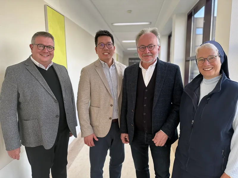 Aktueller und künftiger Chefarzt: PD Dr. Cho-Ming Chao (2. v. l.) wird 2025 die Leitung der Kinder- und Jugendmedizin von PD Dr. Friedrich Ebinger (2. v. r.) übernehmen. Darüber freuen sich Markus Funk (Sprecher der Geschäftsführung) und Sr. Bernadette M. Putz (Geschäftsführung). Foto: St. Vincenz-Kliniken