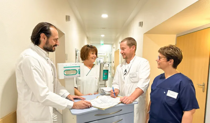 PD Dr. Marco Ezechieli (Chefarzt), Doris Huber (Pflegefachkraft), Henrich Steinmeister (Assistenzarzt) und Sandra Debruyne (Teamleitung Pflege)