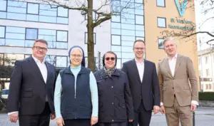 Gemeinsam für eine stabile Zukunft der St. Vincenz-Kliniken: Markus Funk (Sprecher der Geschäftsführung der St. Vincenz-Kliniken), Sr. Bernadette M. Putz (Geschäftsführerin), Sr. M. Katharina Mock (Generaloberin der Paderborner Vincentinerinnen), Sebastian Schrader (Regionalleiter Volksbank Paderborn), Ansgar Käter (Vorstandsvorsitzender der VerbundVolksbank OWL). (v. links)