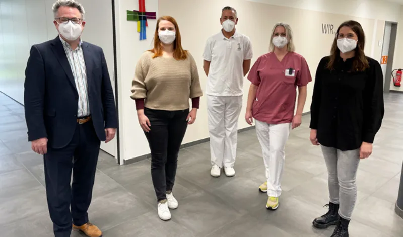 Dr. Josef Düllings, Hauptgeschäftsführer der St. Vincenz-Kliniken, Karina Brüggemeier, Hebammensprecherin des St. Josefs-Krankenhauses, Prof. Dr. Michael Patrick Lux, Chefarzt der Klinik für Gynäkologie und Geburtshilfe, Janina Esau-Hoomann, Schichtleiterin Kreißsaal St. Louise, Pia Lages, Pflegedienstleiterin.