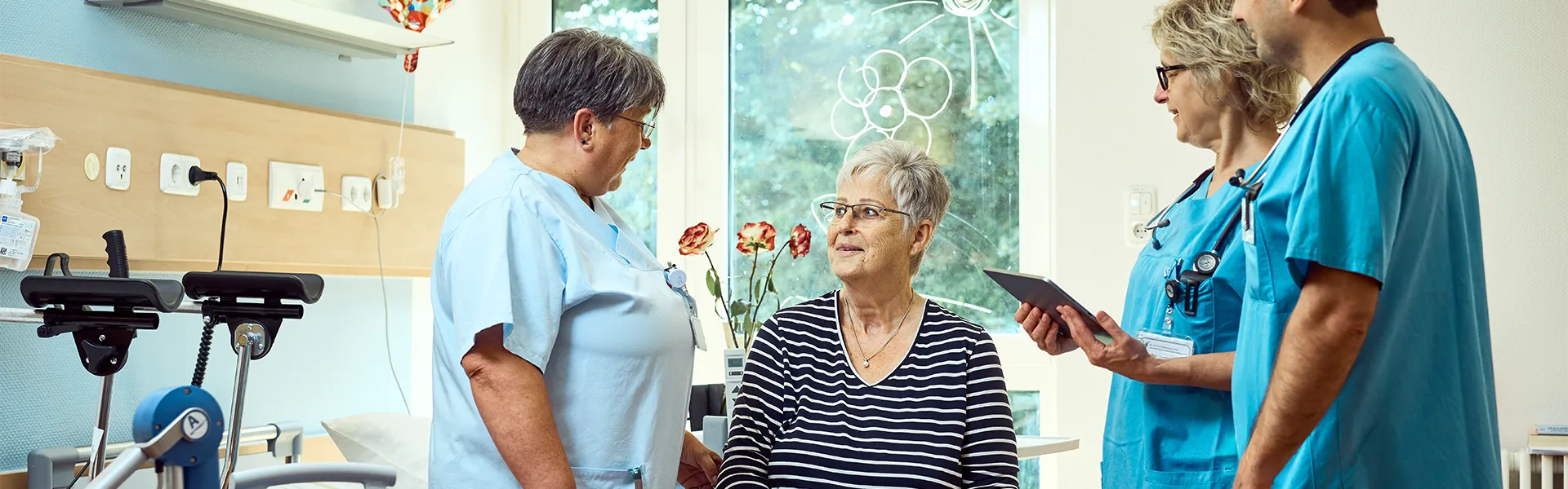 Auf den Stationen führen die Sie betreuenden Pflegefachkräfte regelmäßige pflegerische Durchgänge durch, in denen Vitalzeichenkontrollen (Blutdruck, Temperatur, Puls, Blutzucker, Gewicht), Medikamentenversorgung und ggf. Verbandwechsel vorgenommen werden. Wenn Sie einen Wunsch haben, melden Sie sich bitte über die Rufanlage bzw. besprechen diesen bei den pflegerischen Durchgängen. Die Termine der ärztlichen Visiten teilen wir Ihnen auf der Station mit. Neben den grundpflegerischen Tätigkeiten besprechen die Pflegefachkräfte mit Ihnen auch Weckzeiten und Termine, z.B. für Untersuchungen. Externe Untersuchungen werden soweit möglich am Vortag mit Ihnen besprochen, und Sie erhalten zudem eine schriftliche Information darüber. Der Hin- und Rücktransport wird für Sie organisiert.